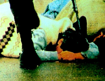 It is only by the end of Je vous salue, Sarajevo that the onlooker sees the whole image for the first time: two soldiers on patrol, a third one standing over three passers-by who lie on the ground. The third soldier is about to kick one of them.