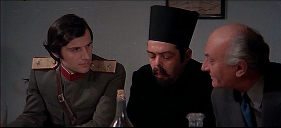 In this sense, his dialogue with the woman in black (Irene Papas) needs to be mentioned, and in it, she openly asks what the partisans believe in when they do not pray, suggesting that this is the reason they do not win. The same woman continues her confession in a rather sharp tone, stating that her husband had died because he kept Stalin’s picture under the pillow while she prayed for him to be cured. To her significantly critical comments regarding the atheism of the partisans (and, it would seem, the communist ideology as a whole), the priest composedly replies that they (the partisans) believe “in themselves, in all of us”. In this way, the priest actually defends the partisans from the attack against their godlessness, although one might expect that he would be the one to criticize them for the mentioned characteristics.