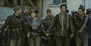 In addition, another interesting scene is when the dying solder refuses the priest’s prayer for his soul, addressing him as “comrade” (“leave it be, comrade preacher”), and giving him his ammunition to use it to “say a prayer” (which he later does in the film, shooting from a big machine gun at the Germans and saying: “Bora, do you hear my prayer?!”). Certain confusion between symbols and values can also be seen here, since the partisan addresses the member of the clergy with “comrade preacher”, and these two words practically immediately exclude one another. The character of the priest is completely contradictory, which is especially visible in the scene when he prays to god for the partisans to breach the German lines, but in the end he rather confidently adds: “And if you're not there, we’ll go through”. This may emphasize two things. On the one hand, this speaks of a certain crisis of the priest’s faith, who is no longer certain whether God exists at all, while placing the partisans above God’s will on the other hand, thus making them a completely independent subject, solely responsible for their own destiny.